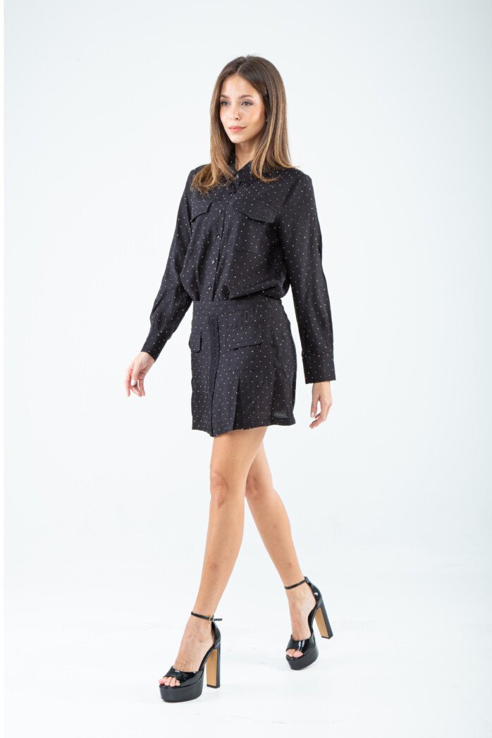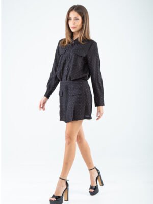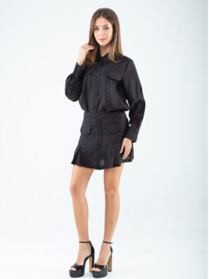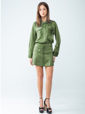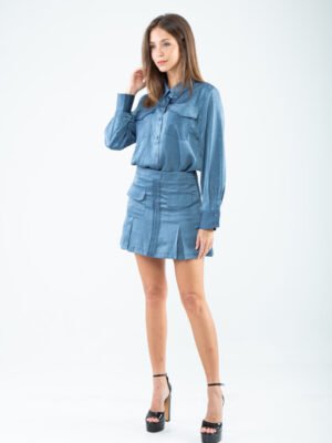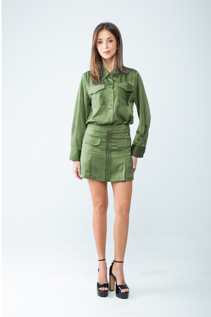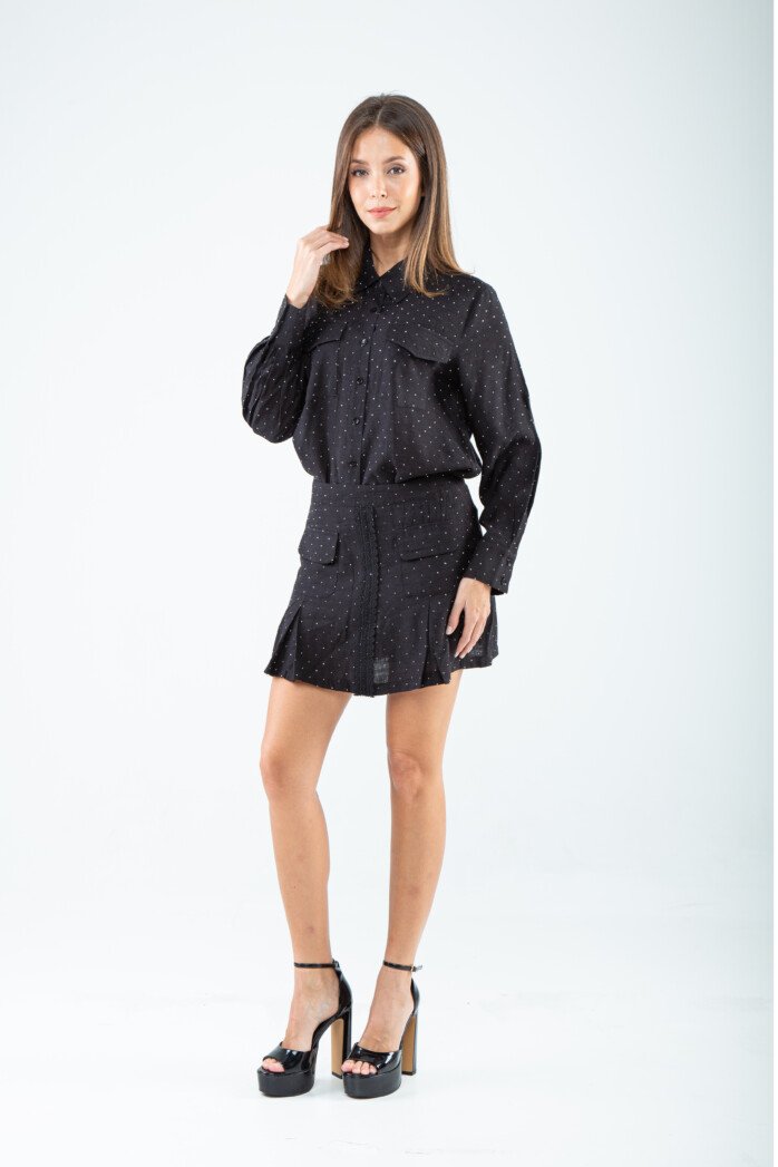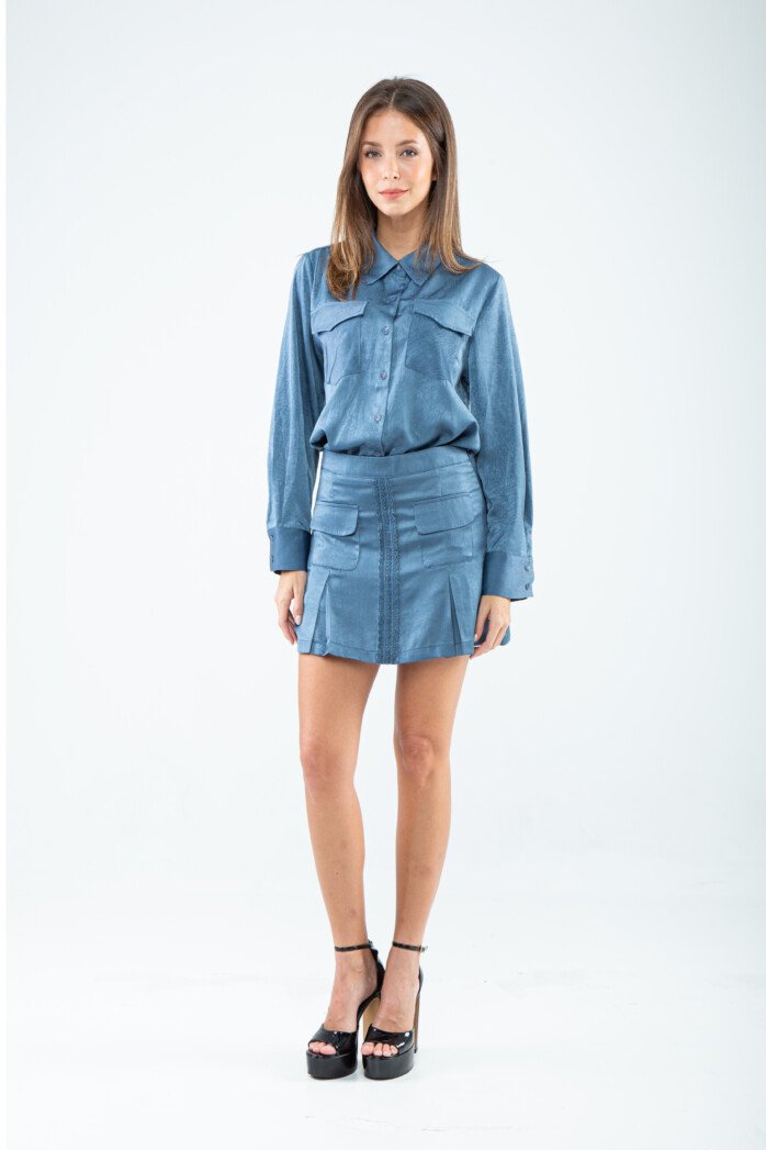 Tailored in a smooth cotton–rayon blend, this shirt masters the art of refined simplicity with a subtly sophisticated touch. The crisp standard collar leads into a sleek button-down front, creating a clean, elongated line that feels both timeless and modern. Long sleeves end in polished buttoned cuffs, adding an element of structured elegance, while the chest features patch pockets with flaps—functional yet undeniably chic.