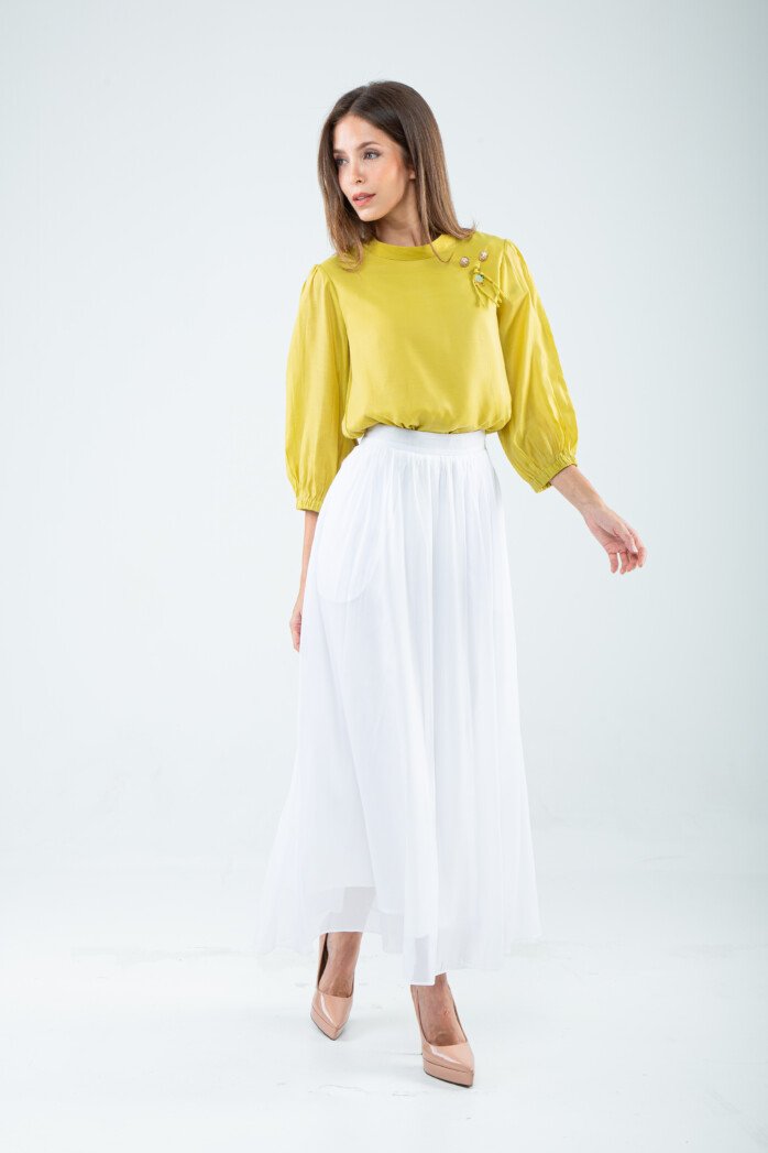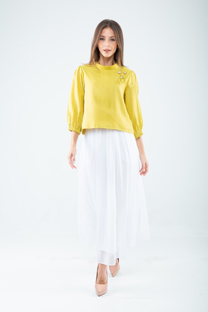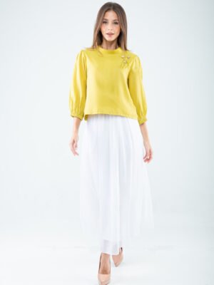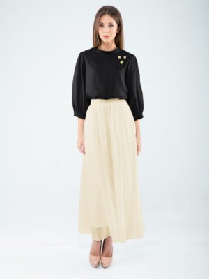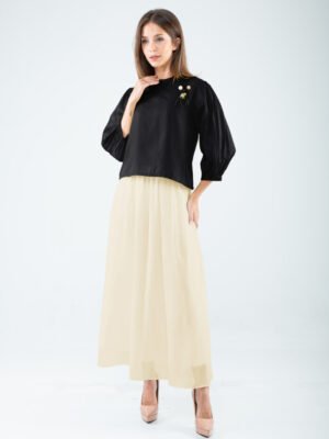 Elevate your wardrobe with a piece that embodies modern sophistication and understated glamour. This impeccably tailored top features refined puff 3/4 sleeves that strike the perfect balance between structure and softness, while a classic round neckline keeps the silhouette clean and timeless. The artful detailing at the left shoulder adds a couture-inspired touch—subtle yet irresistibly chic.