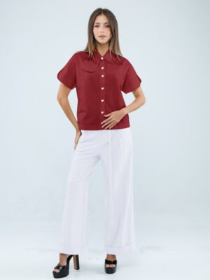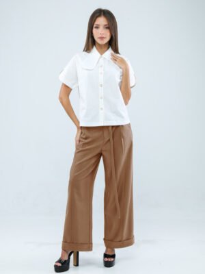 Precision meets ease in these impeccably tailored wide-leg pants. Crafted from a structured yet breathable cotton–poly blend, the fabric holds its shape with quiet authority while allowing fluid movement throughout the day.