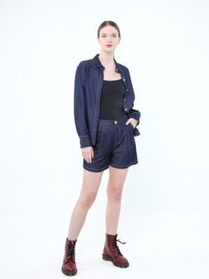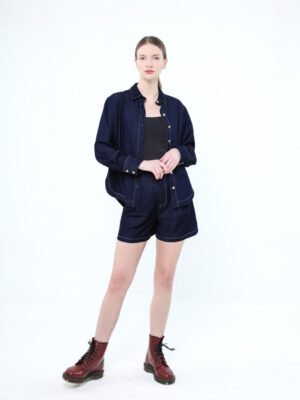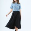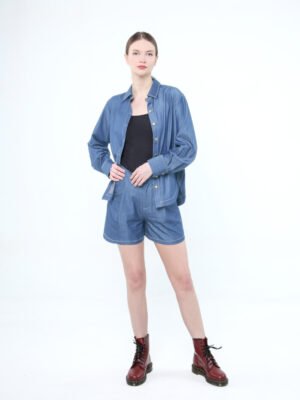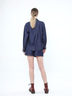 A mixed-denim blouse with a button-down front, back slit, and classic collar—versatile enough to wear as outerwear, effortlessly chic for casual, carefree days out.