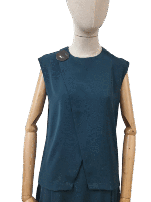 This sleeveless blouse redefines modern minimalism with its clean-cut silhouette and thoughtfully designed front overlap detail. Featuring a classic round neckline, it delivers a polished yet understated aesthetic that feels both contemporary and timeless. The structured design allows it to be worn on its own or styled as an outer layer, making it a versatile addition to any wardrobe. Perfect for mix-and-match dressing, it pairs seamlessly with tailored trousers for formal occasions or relaxed separates for a more casual look. Sophisticated, versatile, and effortlessly chic, this piece is a refined essential for elevated everyday wear.