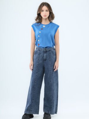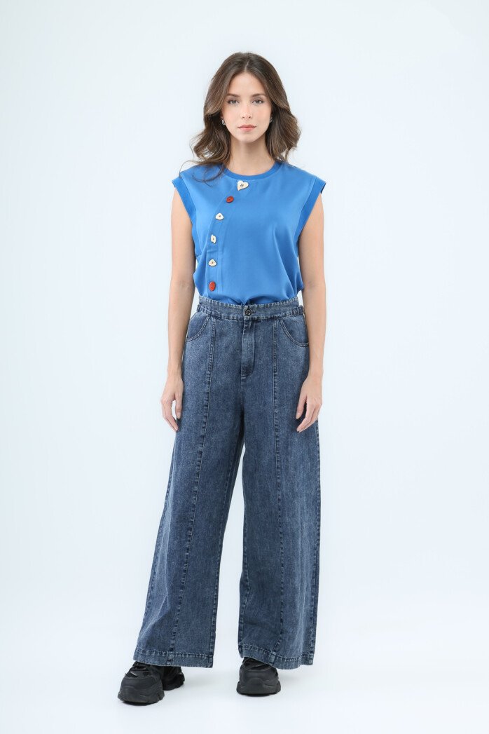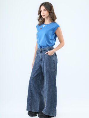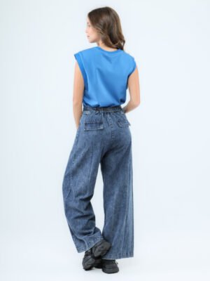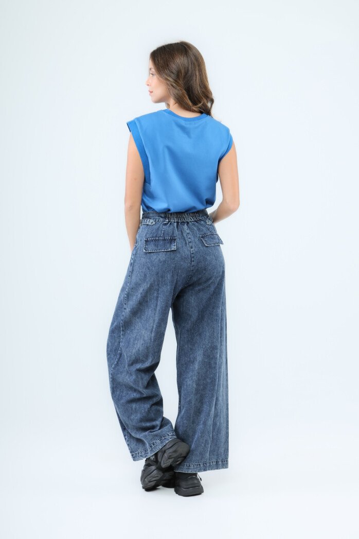 Unleash your street style with these high-waist loose-fit denim pants, blending rugged charm with a chic, modern silhouette. Crafted from durable denim fabric, they feature front inset pockets, structured front panels, and back flap pockets that add an edgy, utilitarian vibe. The stretchable waistband at the back ensures comfort and a customizable fit, making them your new go-to for all-day wear.