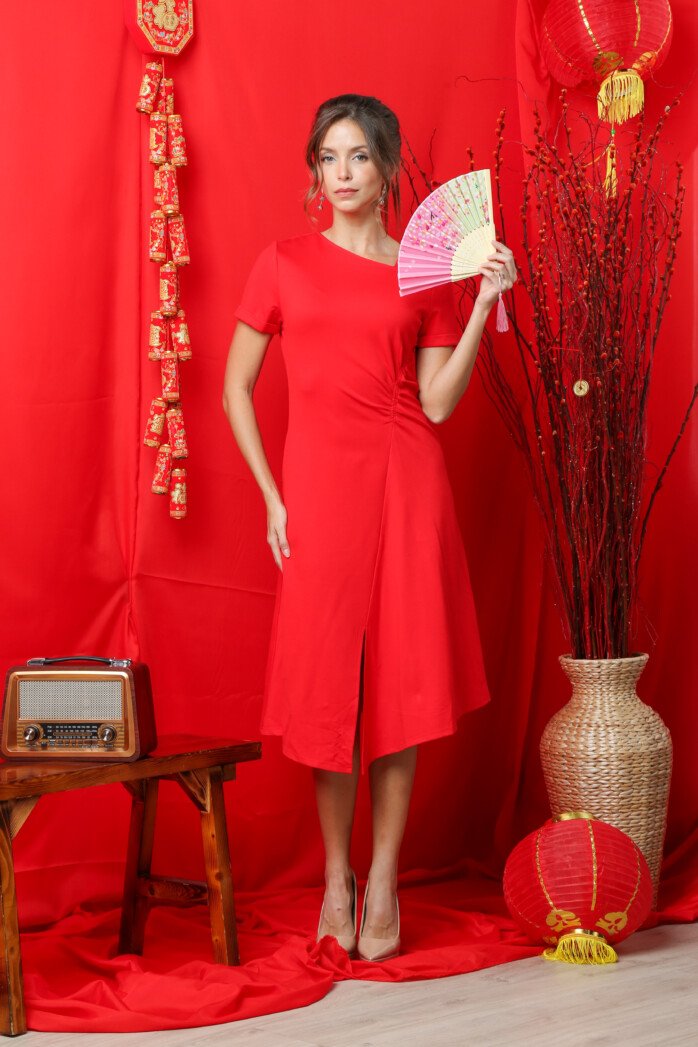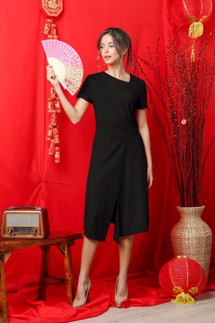 A simple, chic midi dress made from polyester mix fabric, featuring short sleeves, a slanted V-neckline, front waist ruching, and a front slit for an easy-fitting, modern silhouette.