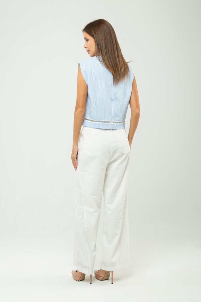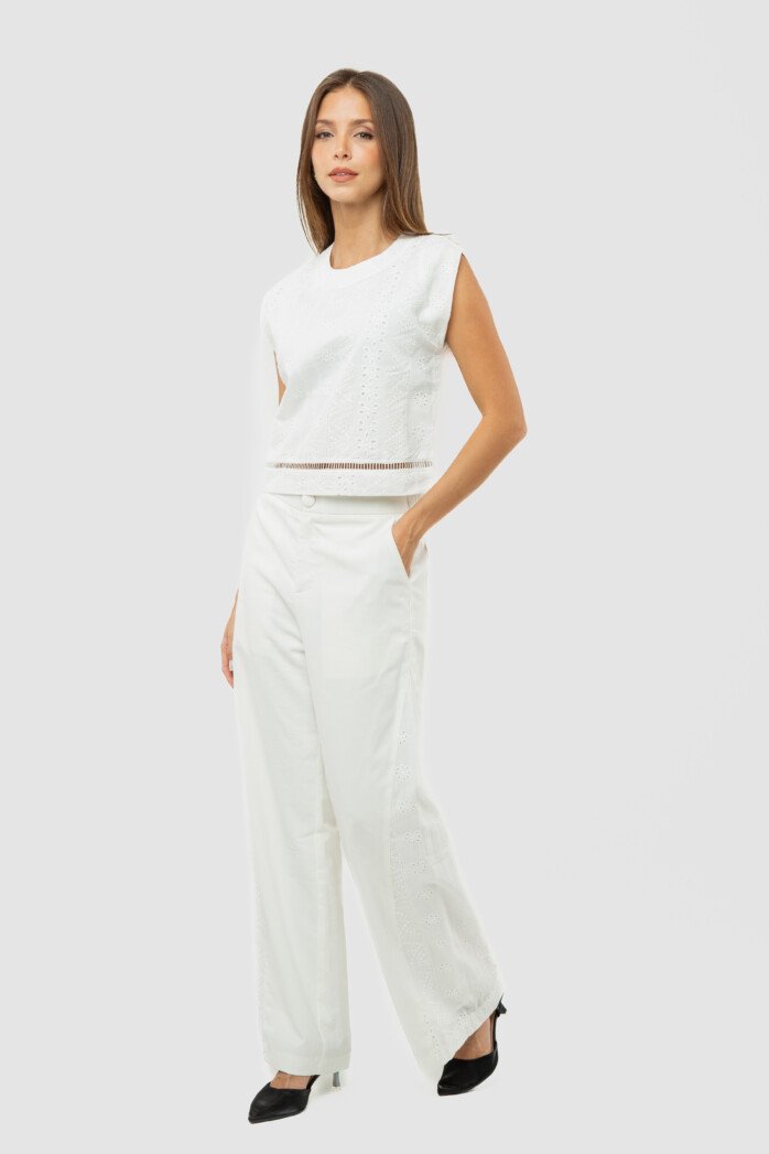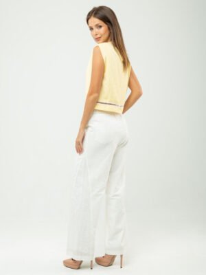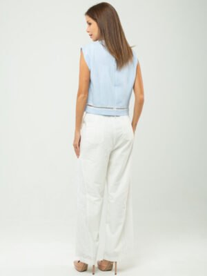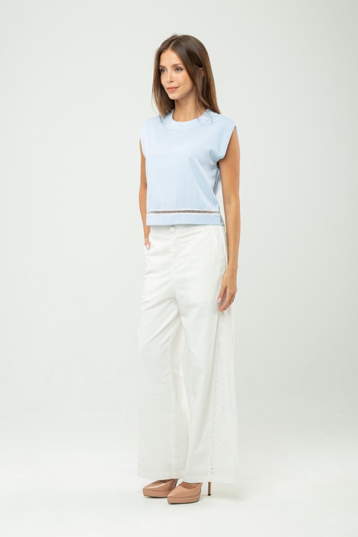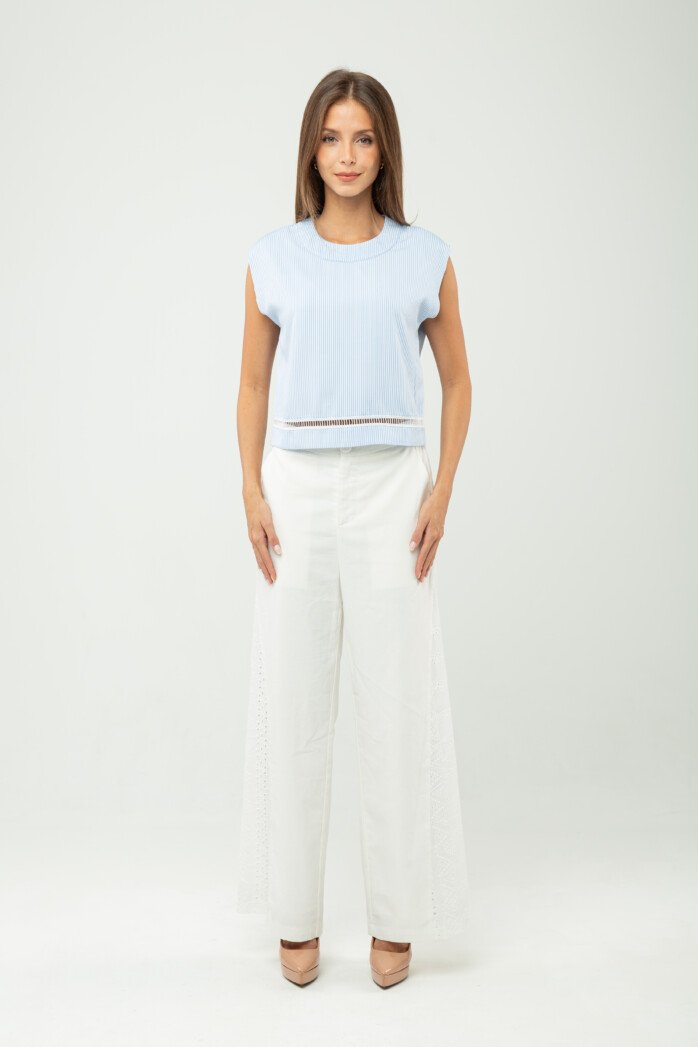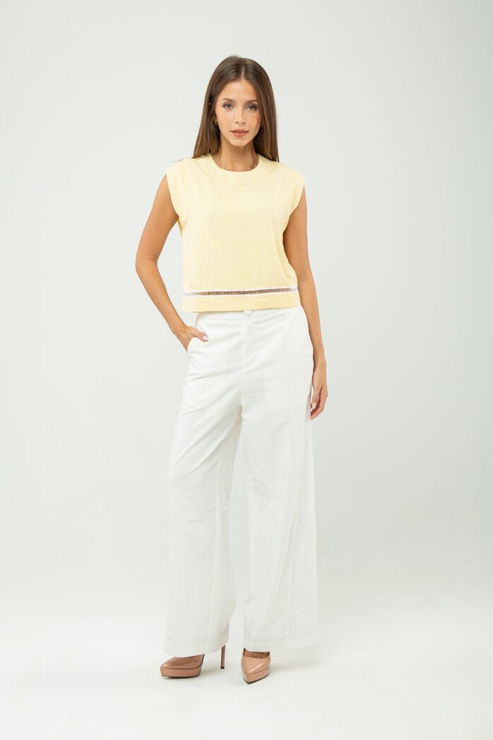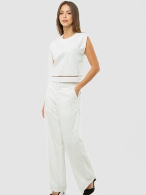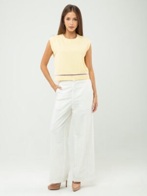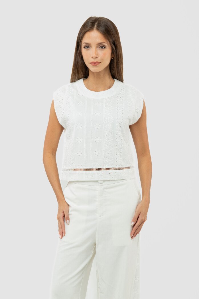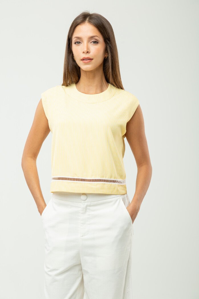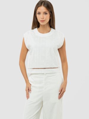 Ease meets subtle romance in this effortlessly polished piece, crafted from a soft cotton–spandex blend that offers gentle structure with comfortable stretch. The clean round neckline and sleeveless cut create a pared-back silhouette, while the softened drop shoulder lends a relaxed, modern attitude—perfectly suited for resort escapes and leisurely days under the sun.
