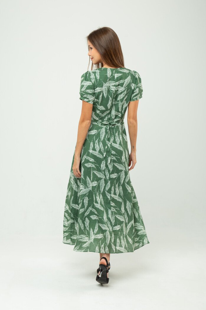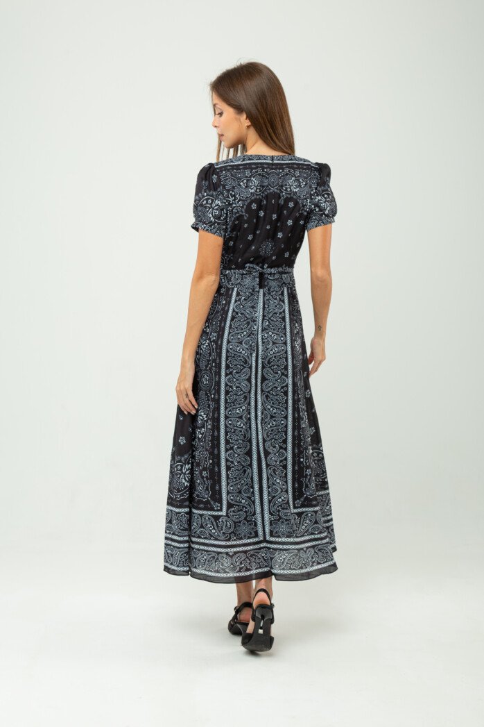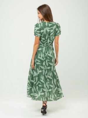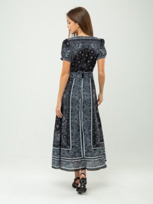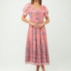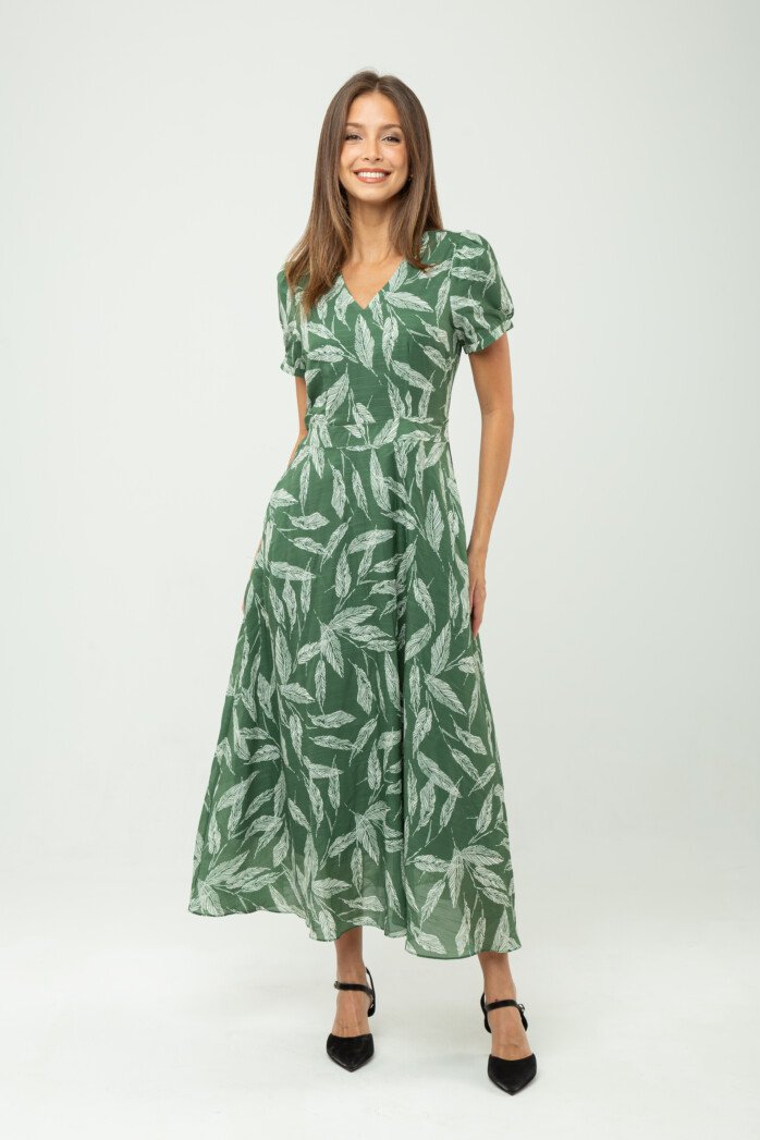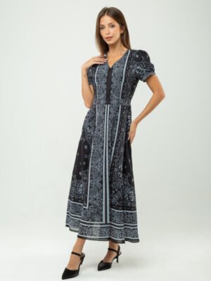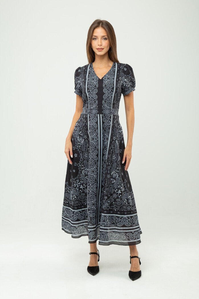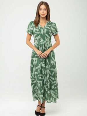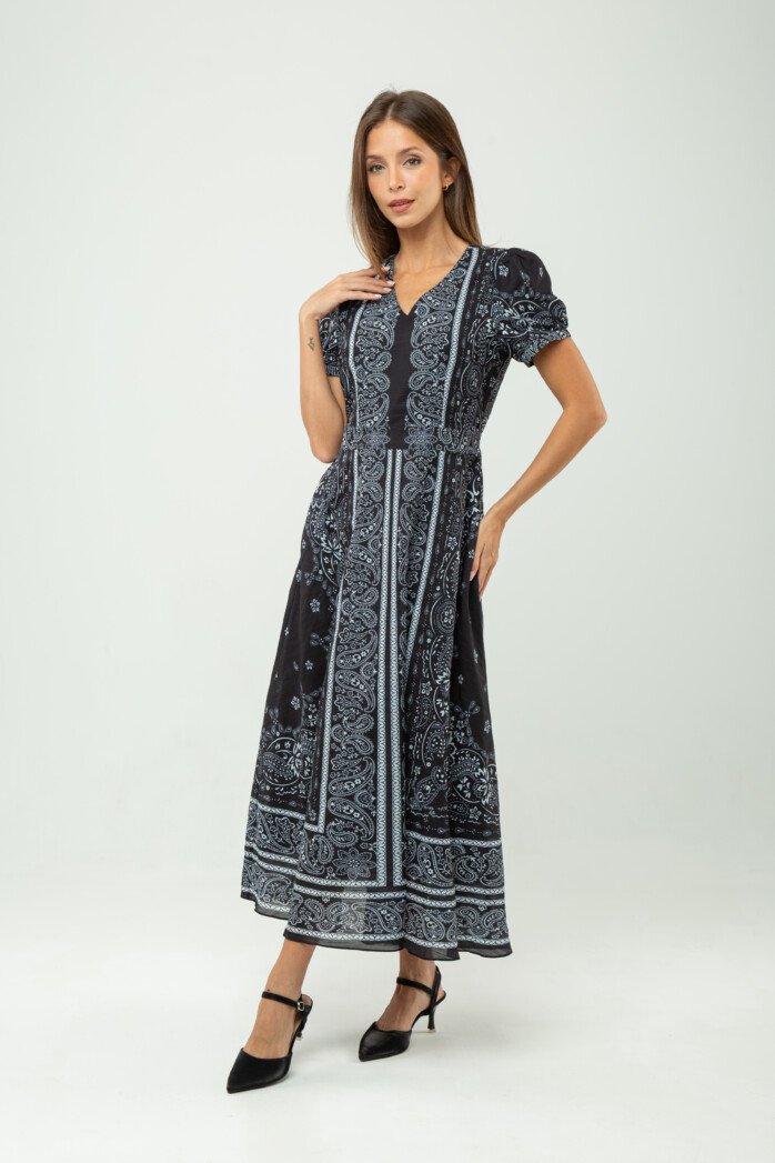 Effortlessly poised between modern romance and timeless refinement, this midi dress is a study in soft structure and fluid femininity. Framed by a flattering V neckline, the silhouette elongates the décolletage while sculpted puff sleeves lend a whisper of vintage drama. The bodice is precisely cut at the waist, releasing into an A-line skirt that moves with an airy, resort-ready grace.