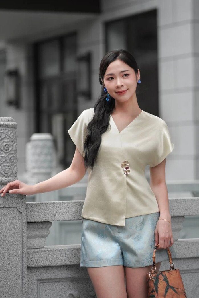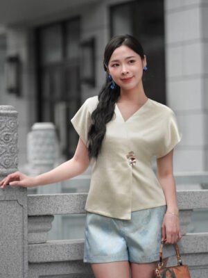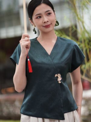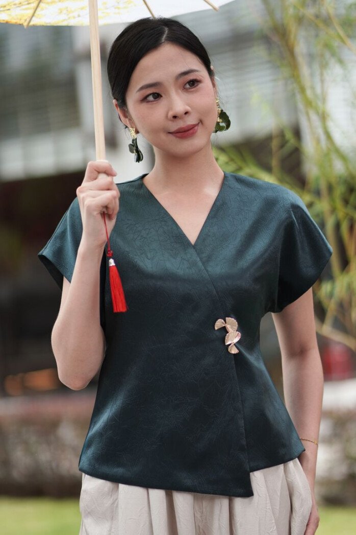 In silky poly crepe, this V-neck silhouette features a front overlap, asymmetrical hem, and delicate mini hand fan detail—an exquisite, sophisticated piece for formal to semi-formal elegance.