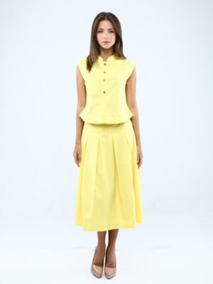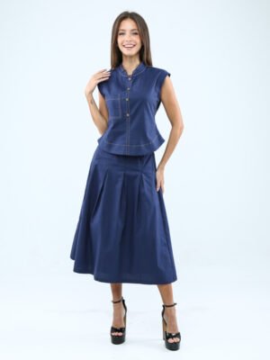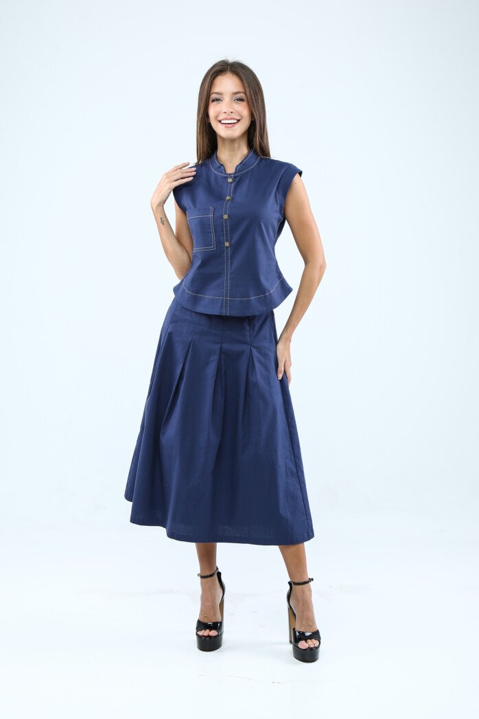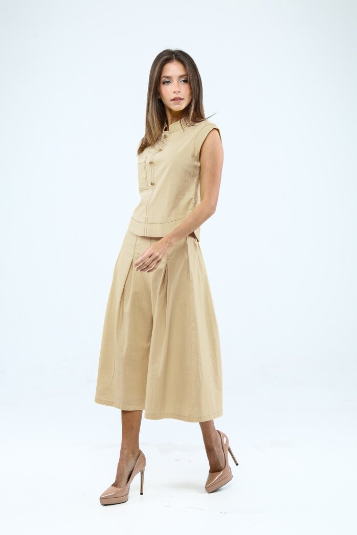 A sleeveless cotton twill top featuring a mandarin collar, decorative front buttons, and a curved hemline, finished with a patch pocket and invisible back zip for a chic, versatile look.