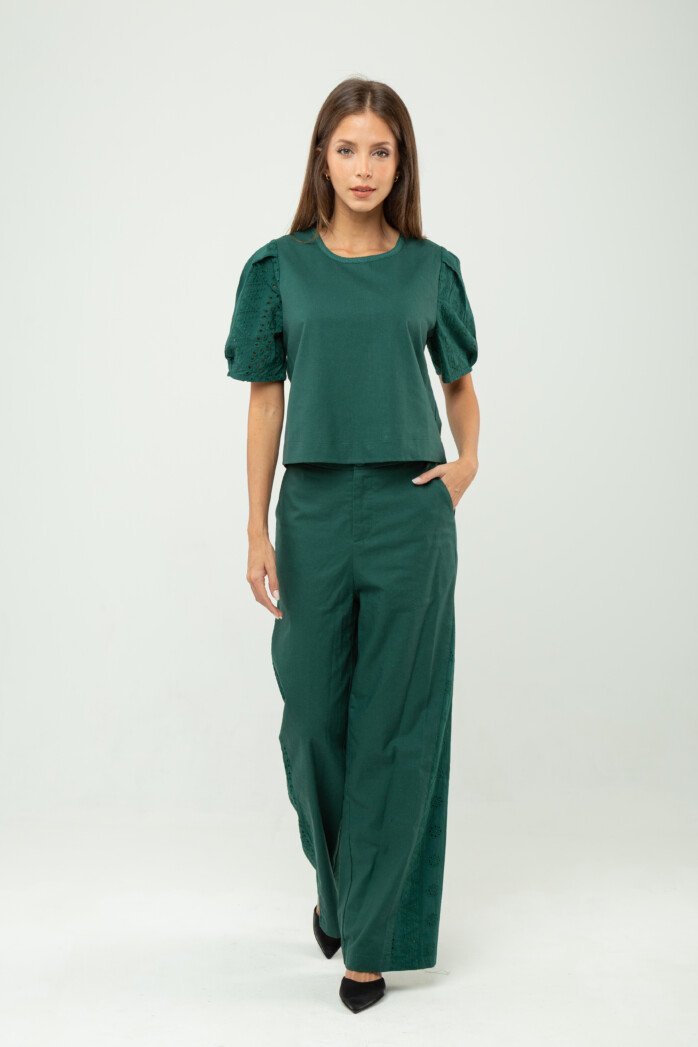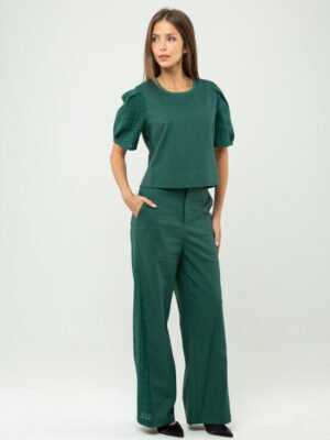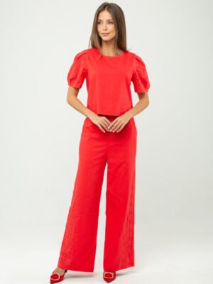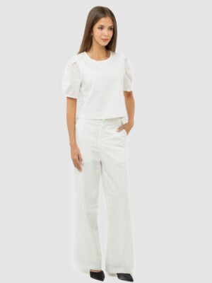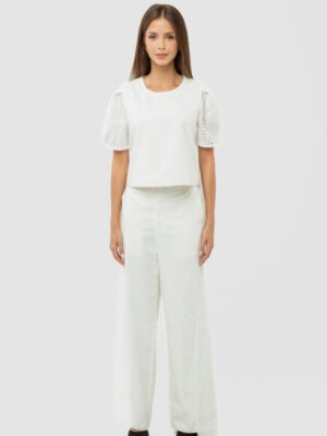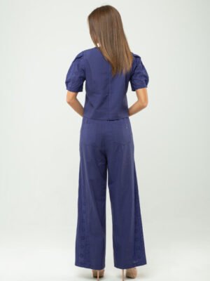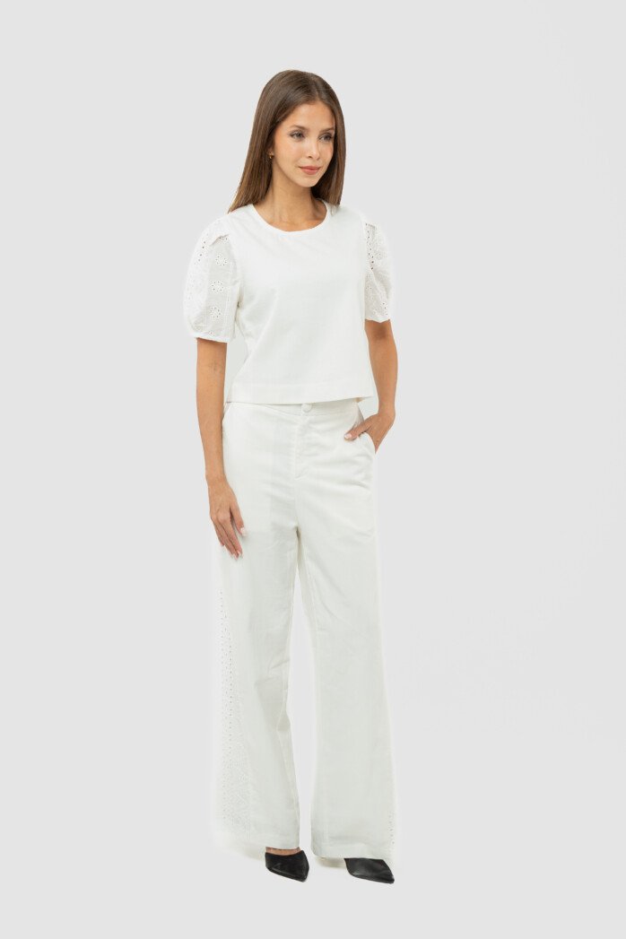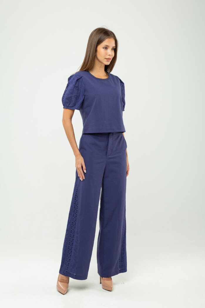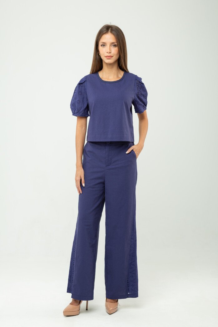 Crafted from a structured yet comfortable cotton–poly blend, these wide-bottom pants feature slanted pockets, a classic zip-and-fly closure, and delicate lace godet detailing. Finished with back patch pockets, they move effortlessly from work to leisure—modern, chic, and endlessly versatile.
