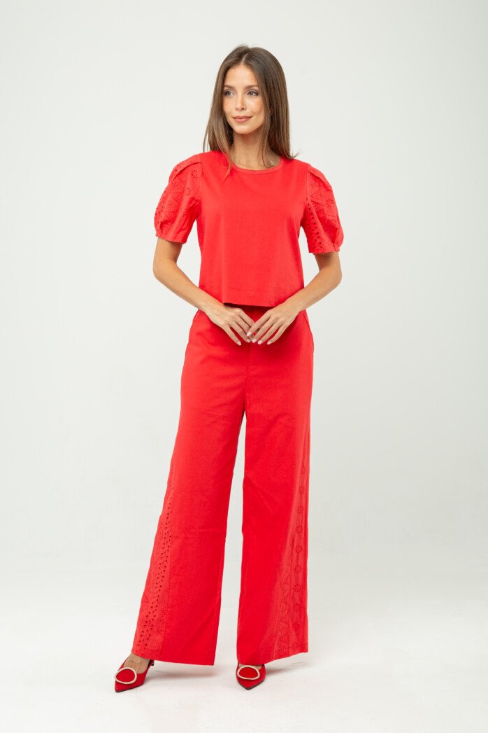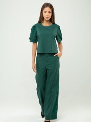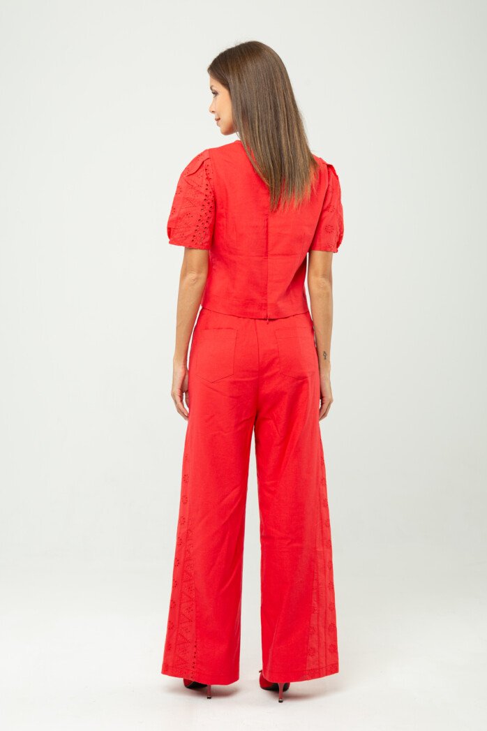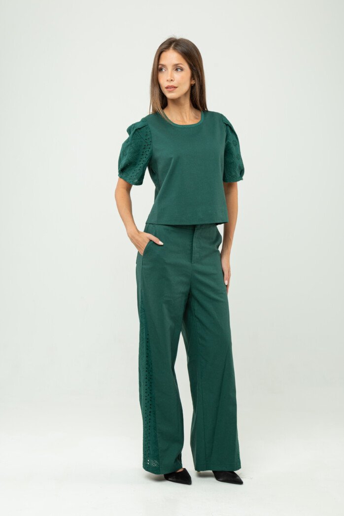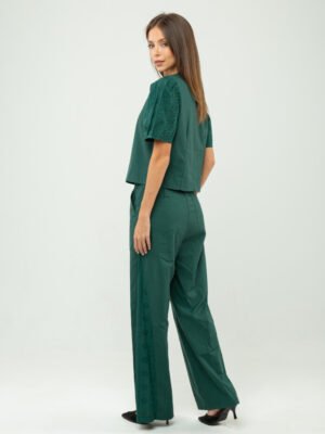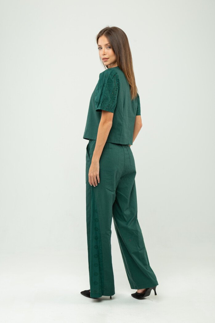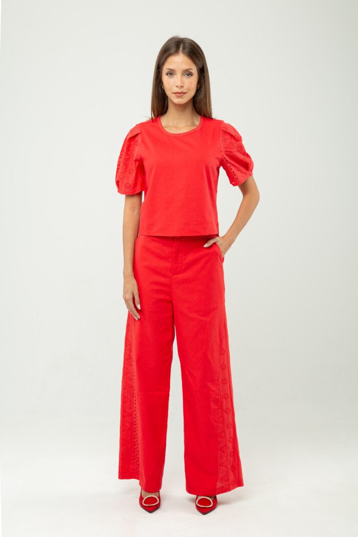 Crafted from a structured yet comfortable cotton–poly blend, these wide-bottom pants feature slanted pockets, a classic zip-and-fly closure, and delicate lace godet detailing. Finished with back patch pockets, they move effortlessly from work to leisure—modern, chic, and endlessly versatile.